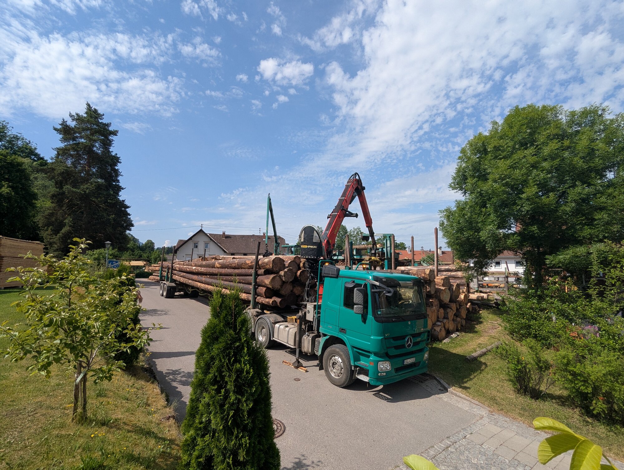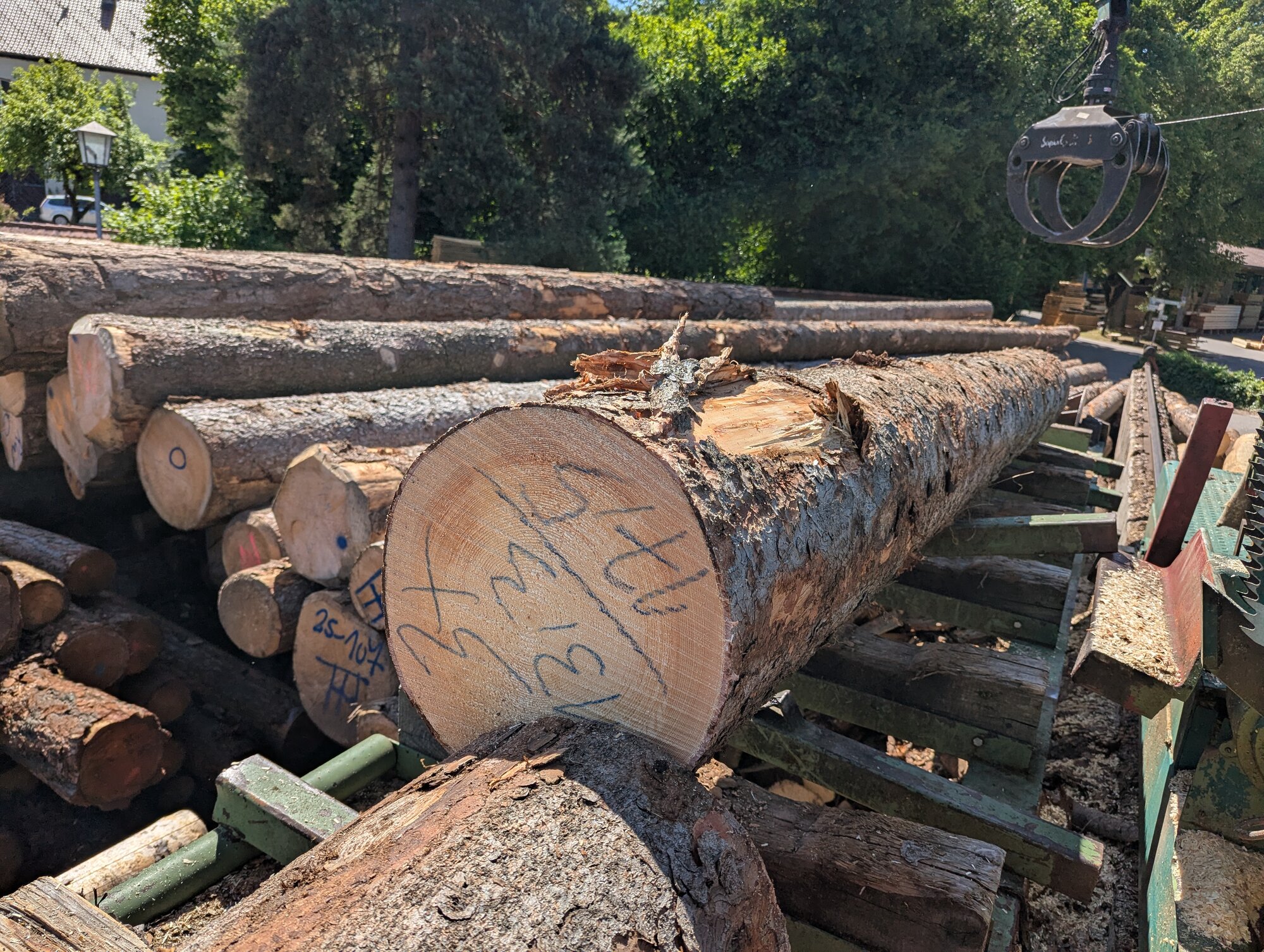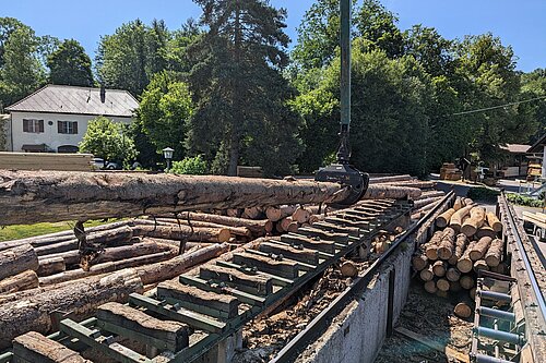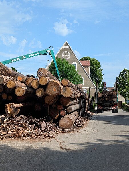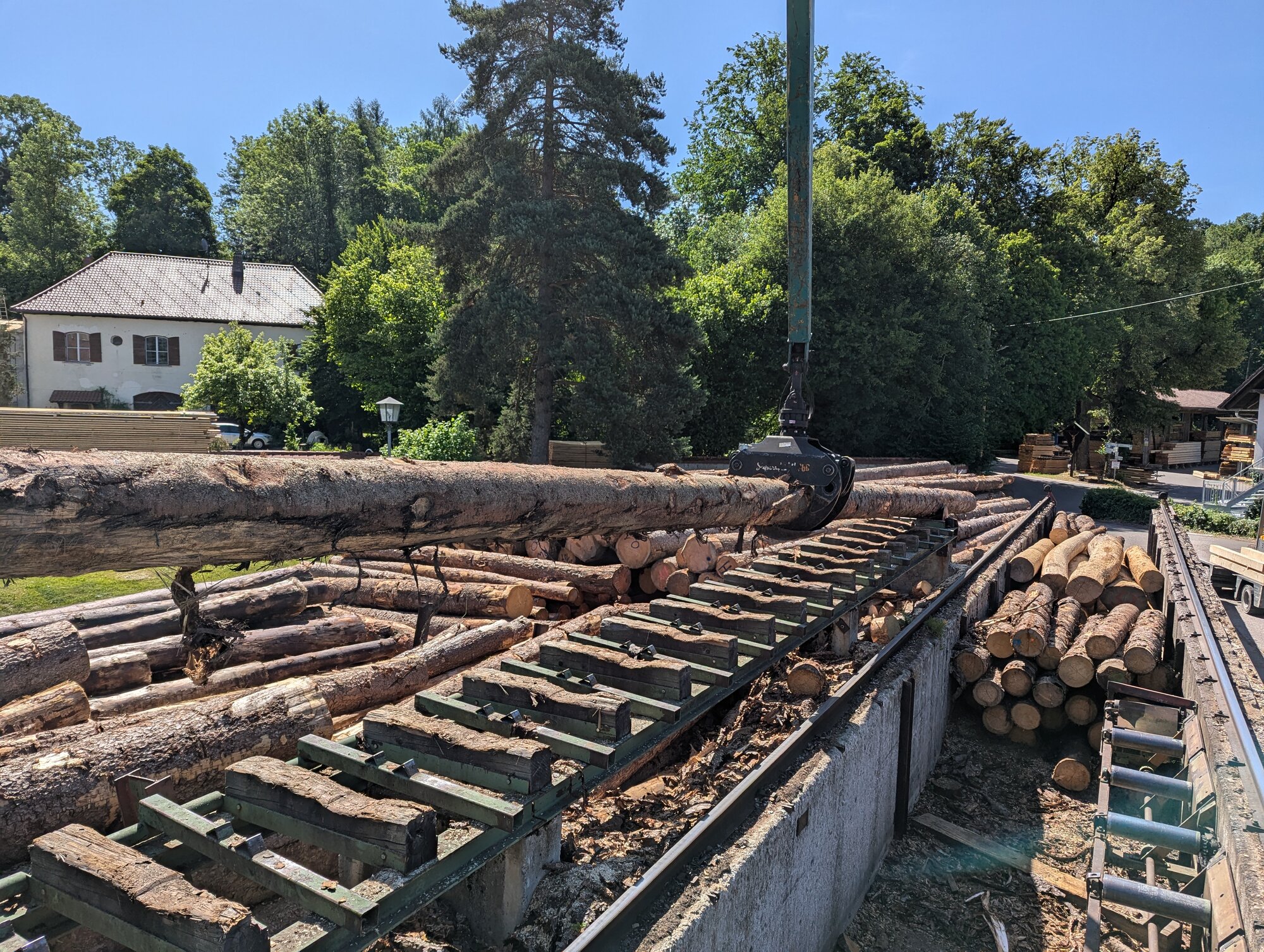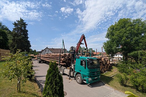 Das Langholz aus der Region wird von Fuhrunternehmern, mit denen wir schon lange zusammen arbeiten, am Sägewerk angeliefert.