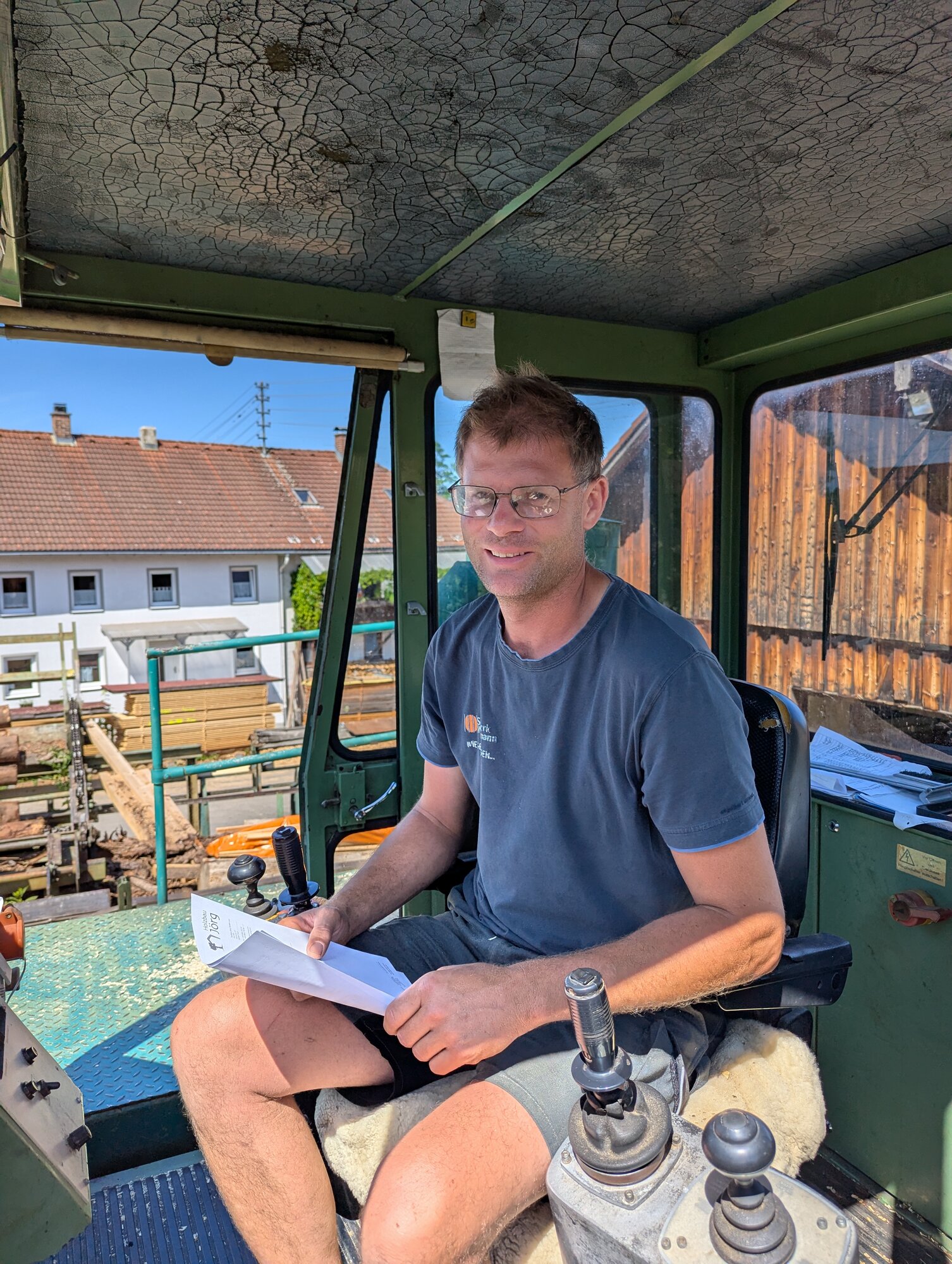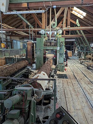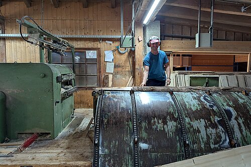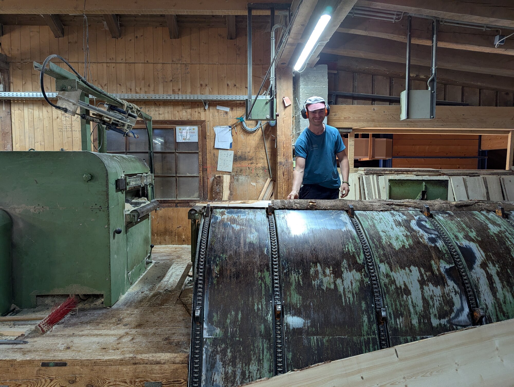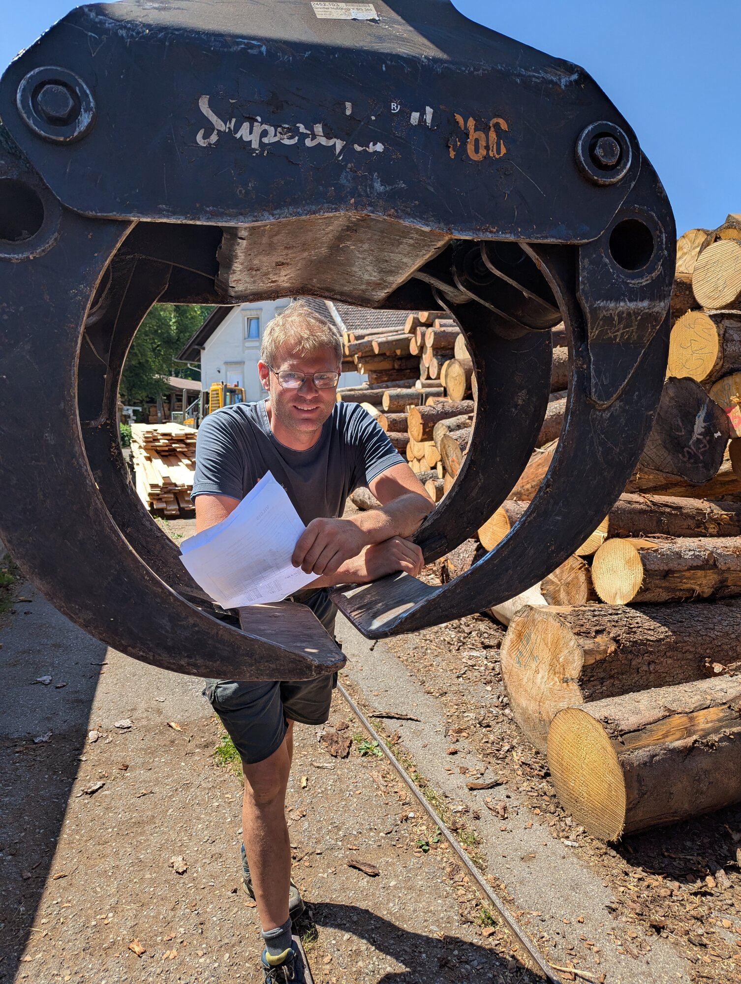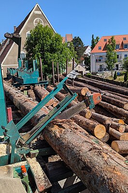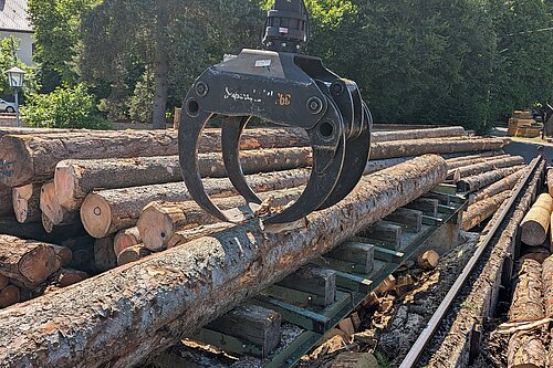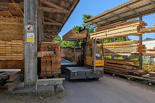 Das Langholz aus der Region wird von Fuhrunternehmern, mit denen wir schon lange zusammen arbeiten, am Sägewerk angeliefert.
