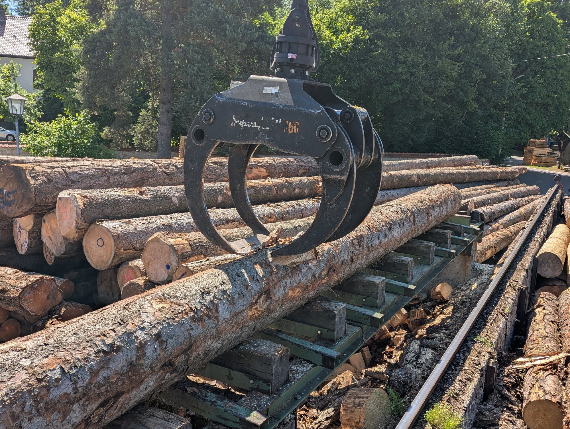 Durch die angebrachte Säge am Kranwagen wird das Langholz abgeschnitten und entsprechend der Holzliste eingeteilt.