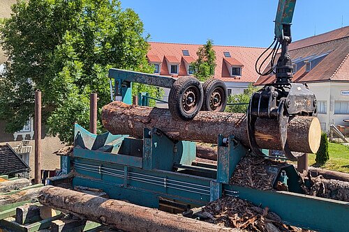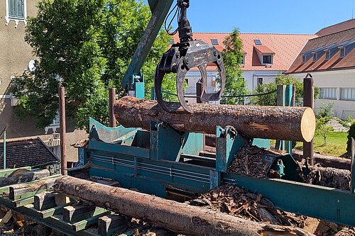 Der direkt am Holzlager und neben dem Kran stehende Wurzelstockreduzierer beseitigt Unförmigkeiten am Stamm und verhindert dadurch Schnittfehler.